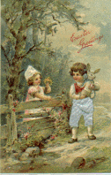 VIC-172. "A Happy Easter". Young girl and boy holding roses. Embossed, printed in Germany. Writing in pencil on back but not postally used. Excellent condition. $7.00.