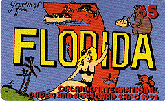 Issued at Mary L. Martin's International Postcard & Paper Expo in Orlando, Florida, in January 1996, the limited issue (500 cards) sold out immediately to enthusiastic collectors. Patterned after the "large letter linen" style of postcards that were popular during the 1940's and 1950's, the phone card reads "Greetings from Florida" and features several images associated with that state: oranges, palm trees, a fisherman, a bathing beauty - even a circus elephant, perched atop the letter "A"!